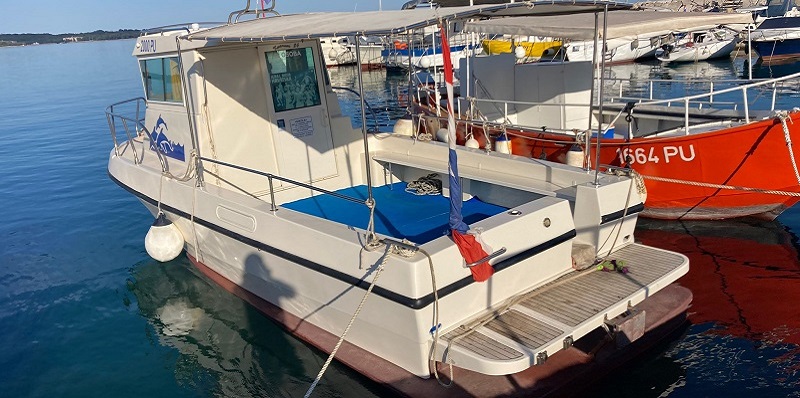La gita si svolge con la barca Nikola, lunga 6 metri. Navigazione attraverso l'arcipelago di Brioni e avvistamento dei delfini.